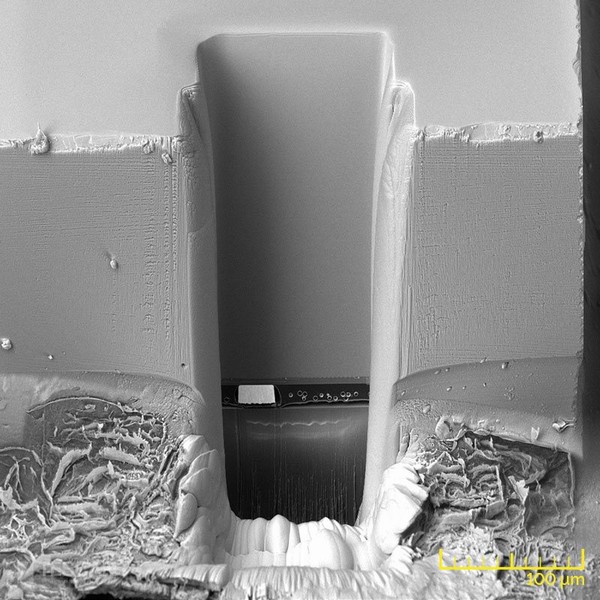 除了光学方法,还可用 TESCAN 双束电镜系统来定位显示器屏幕中的缺陷位置,并以最小的损伤完成截面抛光,将缺陷暴露出来。