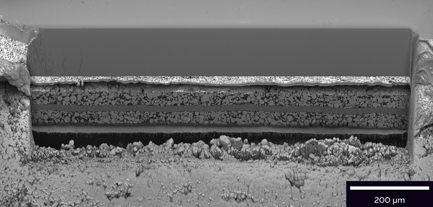 在3.5小时内完成宽度达1 mm横截面的刻蚀, 然后使用TESCAN专有的摇摆样品台,以较小的离子束流抛光横截面,这样可以抑制”幕帘效应“(curtaining),同时还可以在刻蚀过程中原位监控横截面质量。